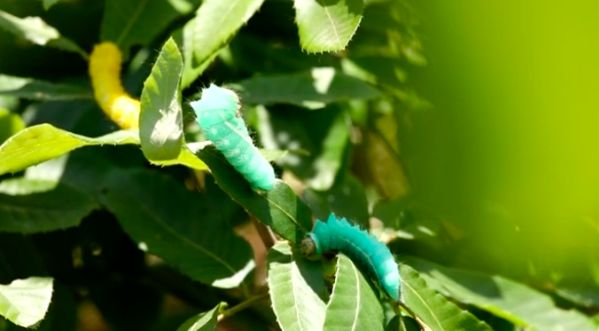 跟其它地方不同,南召養(yǎng)的蠶都是彩色的,是河南省蠶科院專家培育的新品種,不僅能產(chǎn)絲,還可以做觀賞。放養(yǎng)蠶最重要的就是防止鳥來吃,在柞樹上罩上防護(hù)網(wǎng),用來保護(hù)蠶寶寶的安全。
