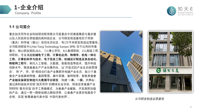 重慶知天而作農(nóng)業(yè)科技研究院有限公司是重慶中控惠通集團(tuán)與重慶璧山區(qū)人民政府合資組建的高科技企業(yè),公司研發(fā)制造基地位于西部(重慶)科學(xué)城(璧山)雙創(chuàng)生態(tài)社區(qū),有1萬(wàn)平米研發(fā)制造基地。公司歐洲研發(fā)中心Hui Tong Technology Europe SPRL位于比利時(shí)布魯塞爾。