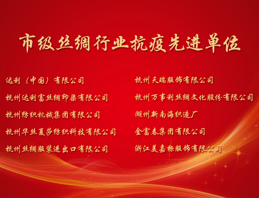 經(jīng)企業(yè)自愿申報和理事會研究,授予達利(中國)有限公司等10家企業(yè)“絲綢行業(yè)抗疫先進單位”榮譽稱號。