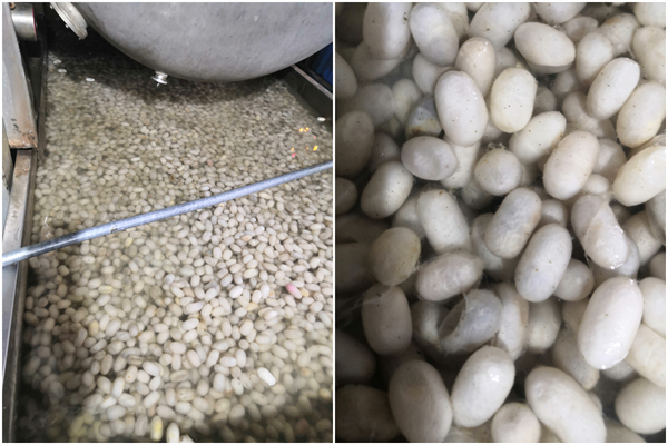 鮮繭繅絲,具有減少原料成本、提高經(jīng)濟(jì)效益的優(yōu)勢(shì),但產(chǎn)品質(zhì)量不高,因此鮮繭繅絲的潛能沒有充分得到發(fā)揮。由于鮮繭絲膠不穩(wěn)定,鮮繭經(jīng)過真空滲透后直接繅絲或再經(jīng)過長(zhǎng)籠煮繭機(jī)煮繭,在吐水、蒸煮時(shí)容易將蠶繭煮崩潰,因此只能使用較低的煮繭溫度,絲膠沒有得到充分膨潤(rùn),在繅絲時(shí)絲膠膠著力大、缺乏黏性,造成清潔、潔凈、抱合指標(biāo)成績(jī)不佳。