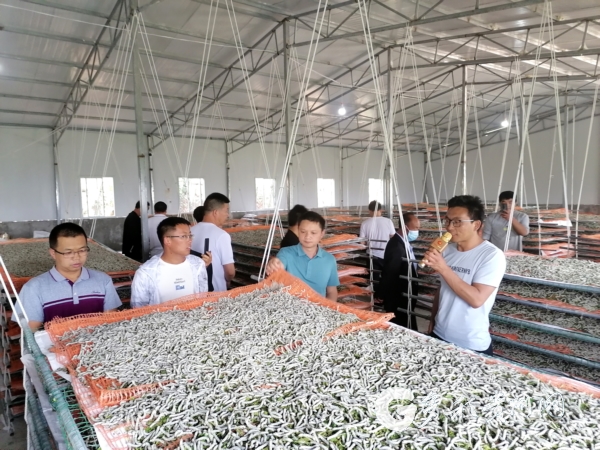 學(xué)員們參觀學(xué)習(xí)大蠶集中飼養(yǎng)基地。