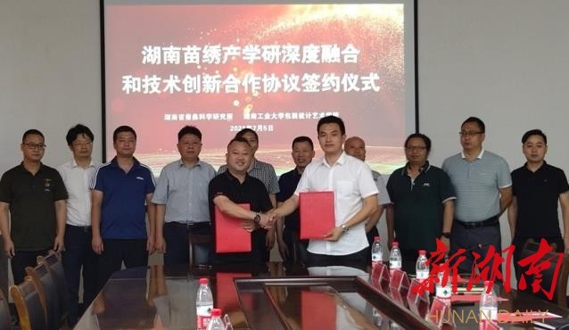 7月5日,湖南工業(yè)大學包裝設計藝術學院與湖南省蠶??茖W研究所簽約,將蠶桑文化與苗繡巧妙結合,擴展延伸苗繡產(chǎn)業(yè)鏈,實現(xiàn)苗繡提質升級,助力鄉(xiāng)村振興。