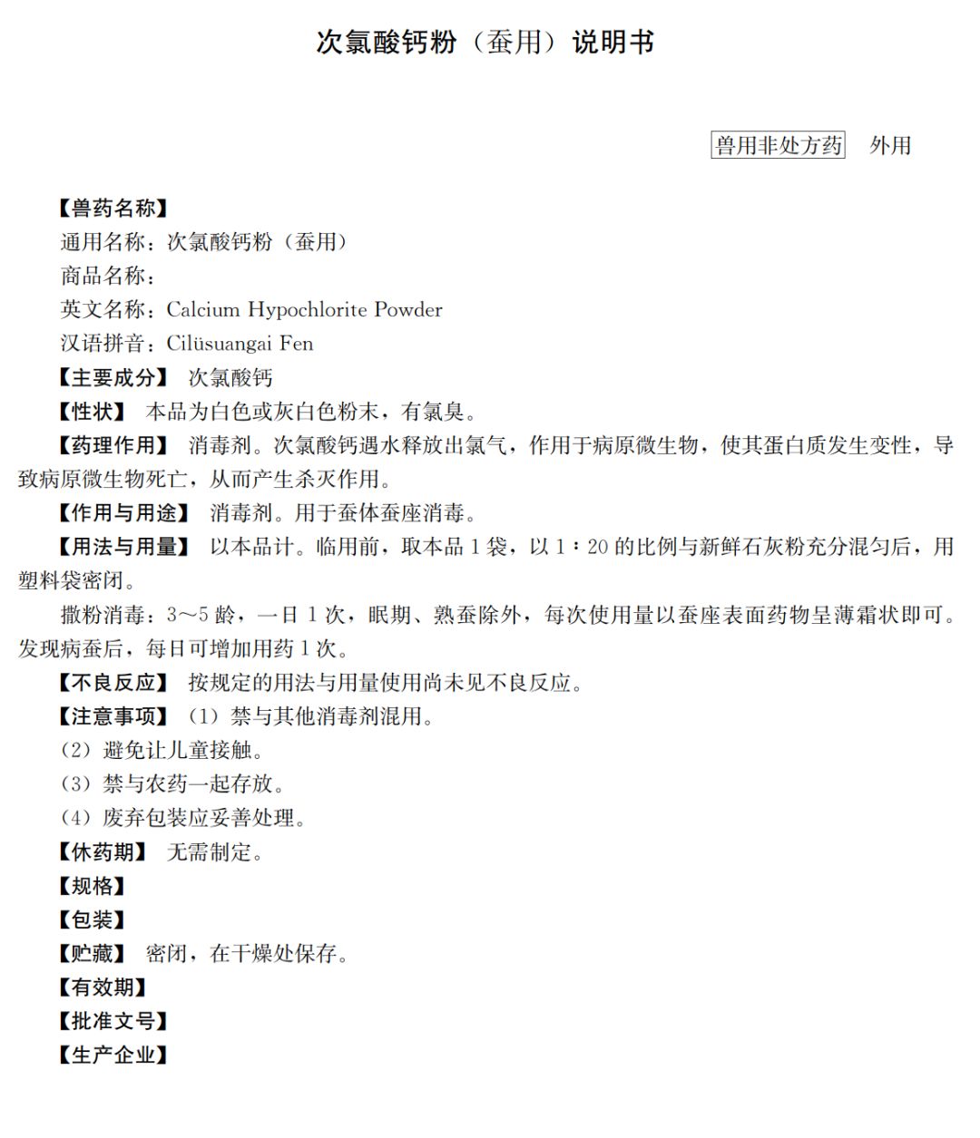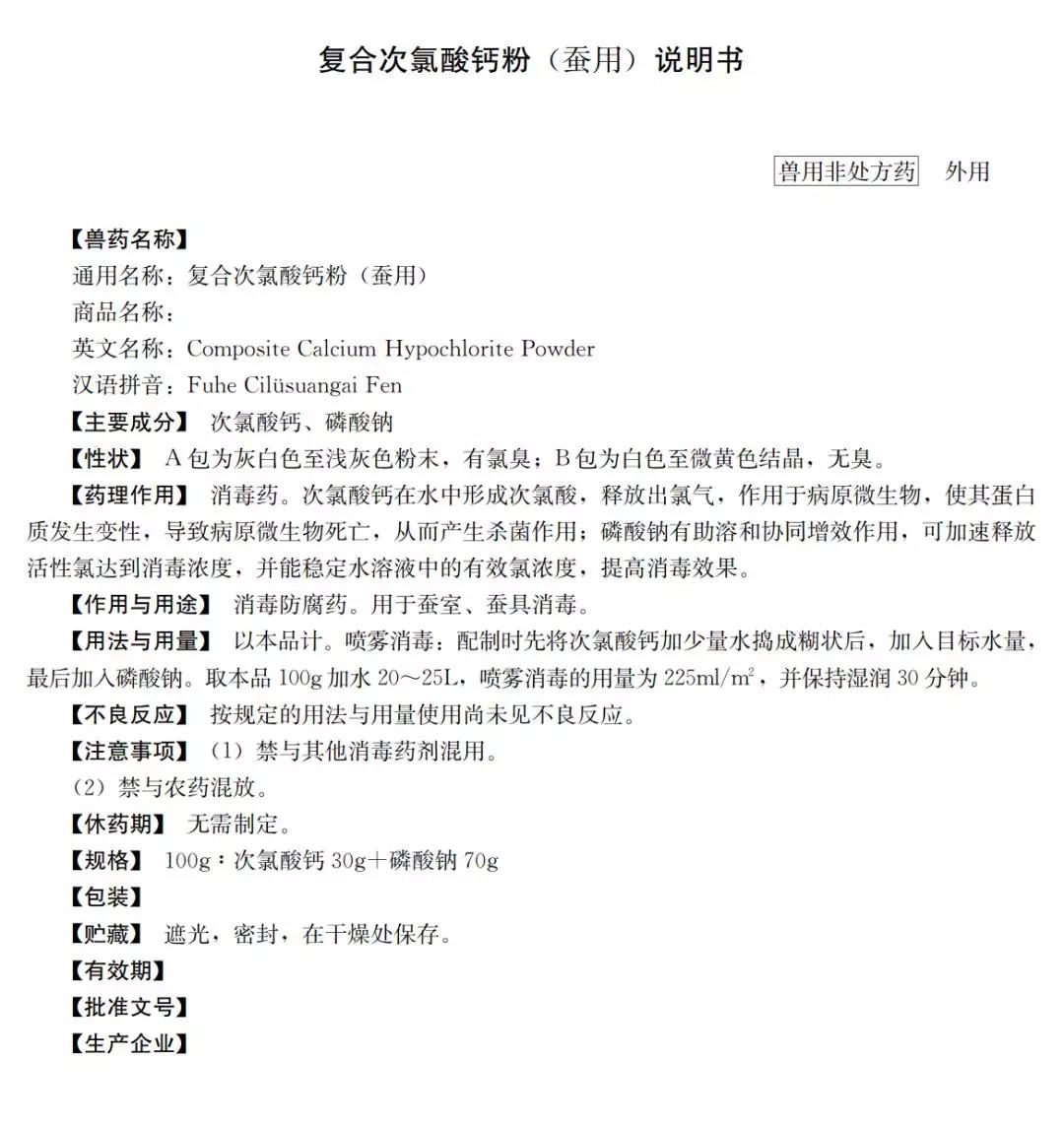| 復(fù)合次氯酸鈣粉(蠶用) | 100g:漂粉精30g+磷酸三鈉70g | 蠶室、蠶具、桑葉葉面消毒 | 9818 |