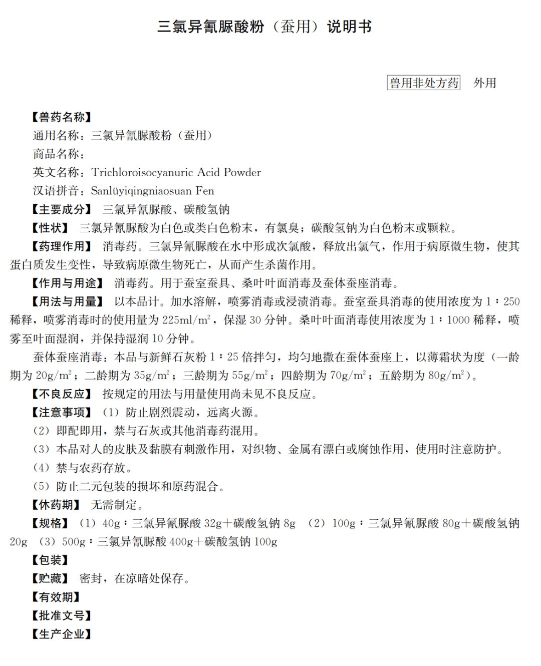 | 三氯異氰脲酸粉(蠶用) | 40g:三氯異氰脲酸32g+碳酸氫鈉8g | 蠶體、蠶座消毒 | 9806 |