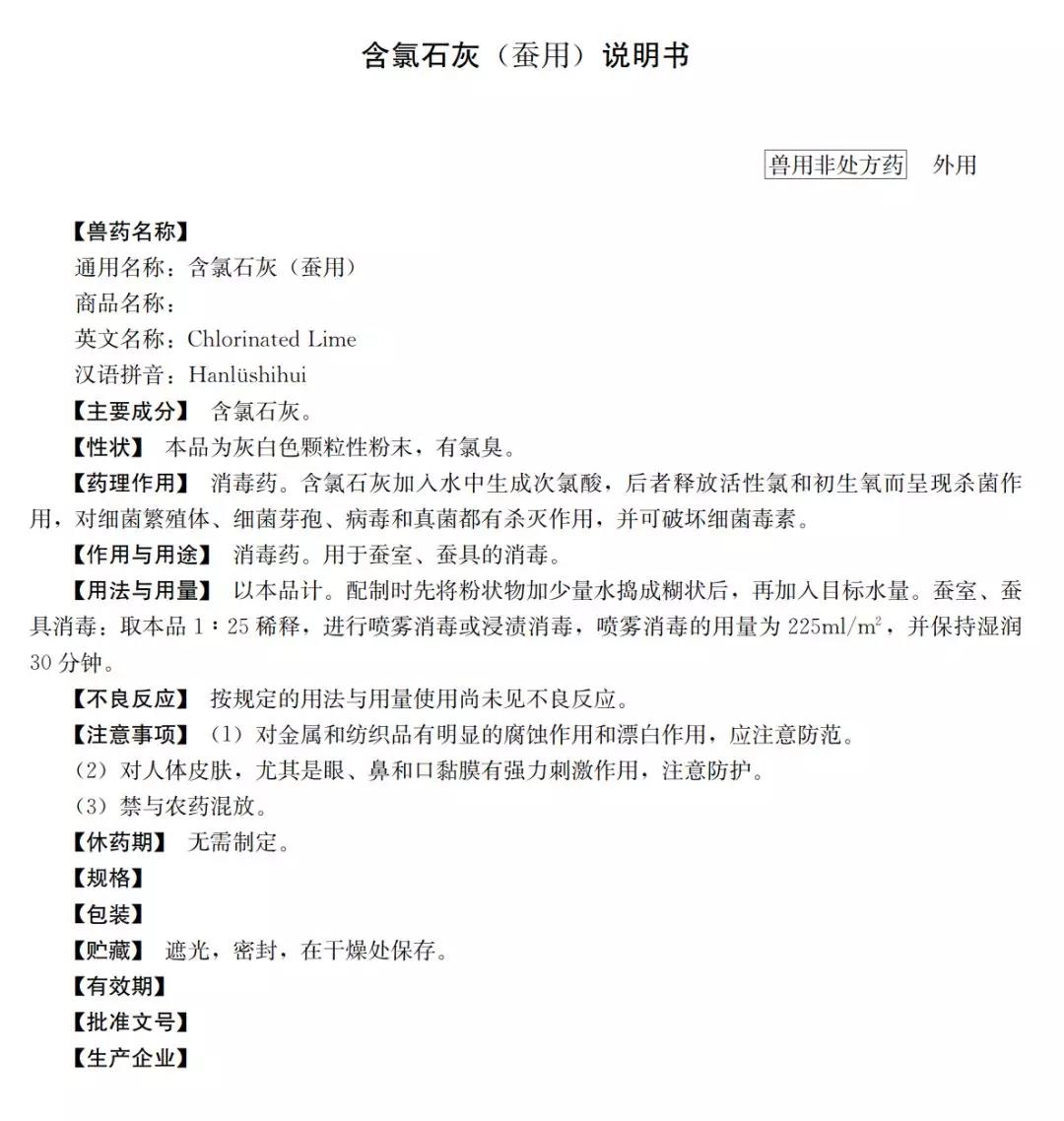 | 含氯石灰(蠶用) | 含有效氯不得少于25.0% | 蠶室、蠶具、桑葉和卵面消毒 | 9803 |