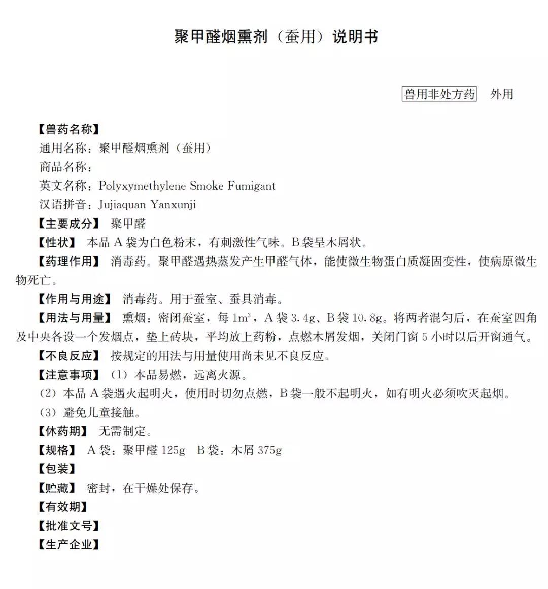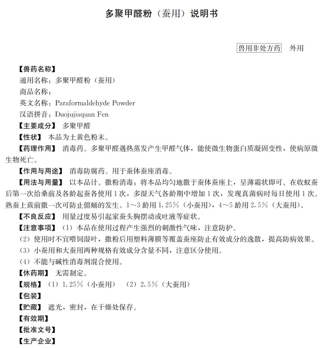 | 多聚甲醛粉(蠶用) | 2.5% | 大蠶期蠶體蠶座消毒 | 9822 |