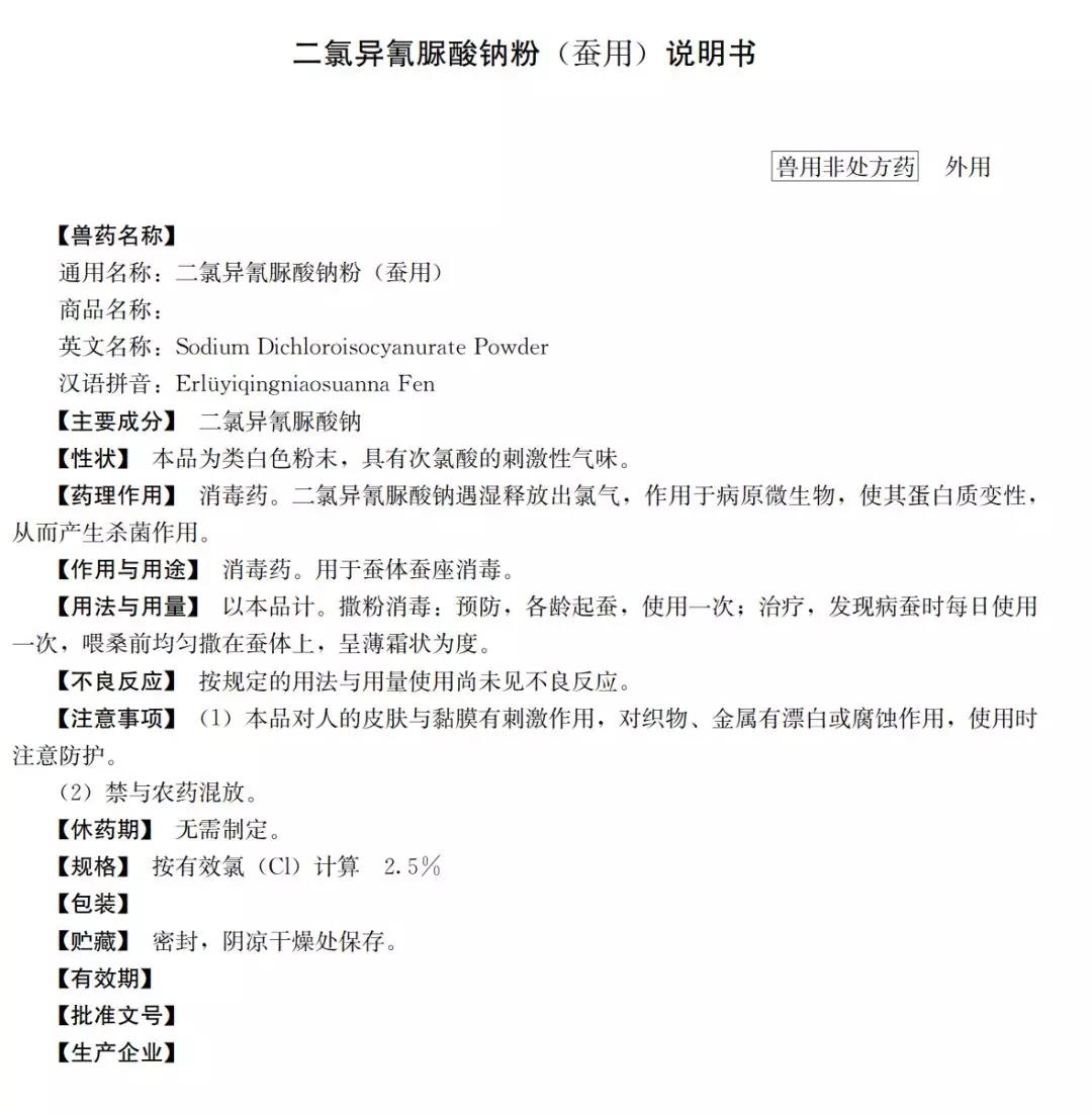 | 二氯異氰脲酸鈉粉(蠶用) | 2.5%(以有效氯計算) | 蠶體蠶座消毒 | 9831 |