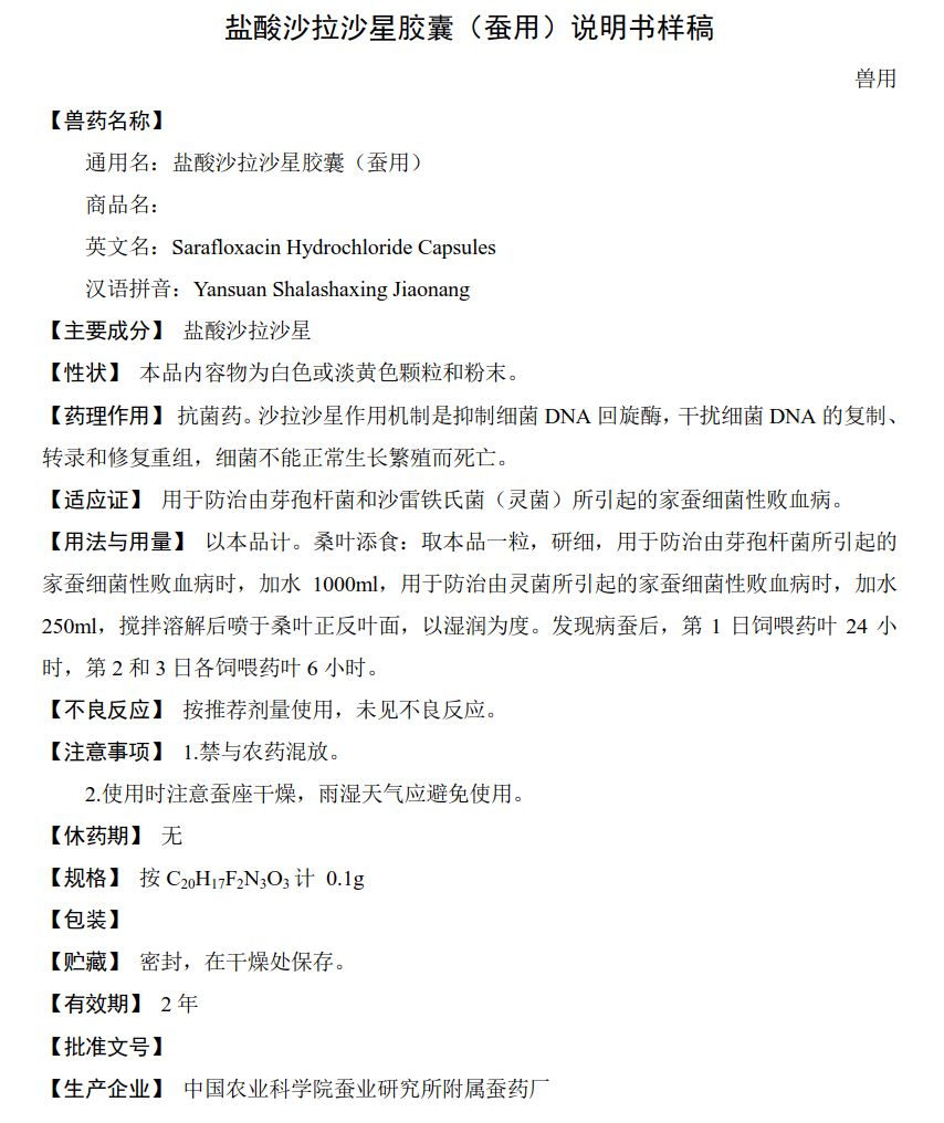 | 鹽酸沙拉沙星膠囊(蠶用) | 0.1g | 防治家蠶細(xì)菌性敗血病 | 2408 |