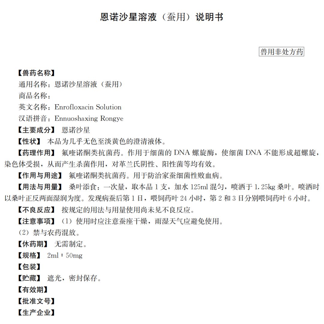 | 恩諾沙星溶液(蠶用) | 2ml:100mg | 防治家蠶細(xì)菌性敗血病 | 9801 |