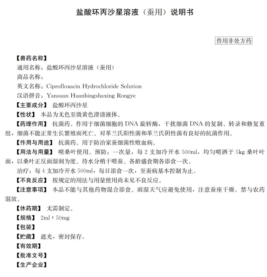 | 鹽酸環(huán)丙沙星溶液(蠶用) | 2ml:50mg | 防治家蠶細(xì)菌性敗血病 | 9810 |
