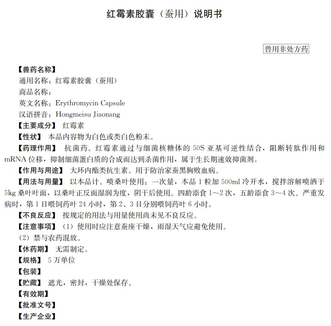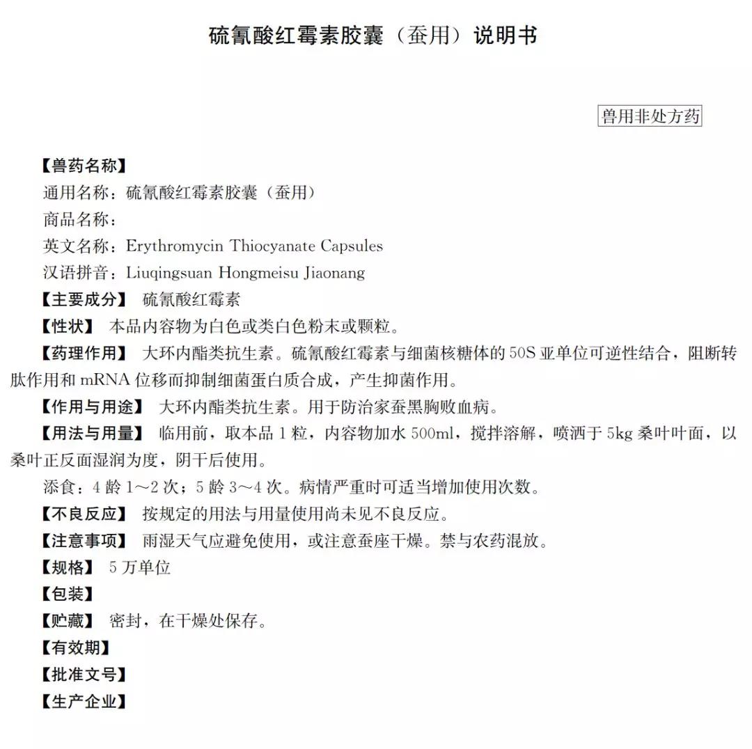 | 硫氰酸紅霉素膠囊(蠶用) | 5萬單位 | 防治家蠶黑胸敗血病 | 9845 |