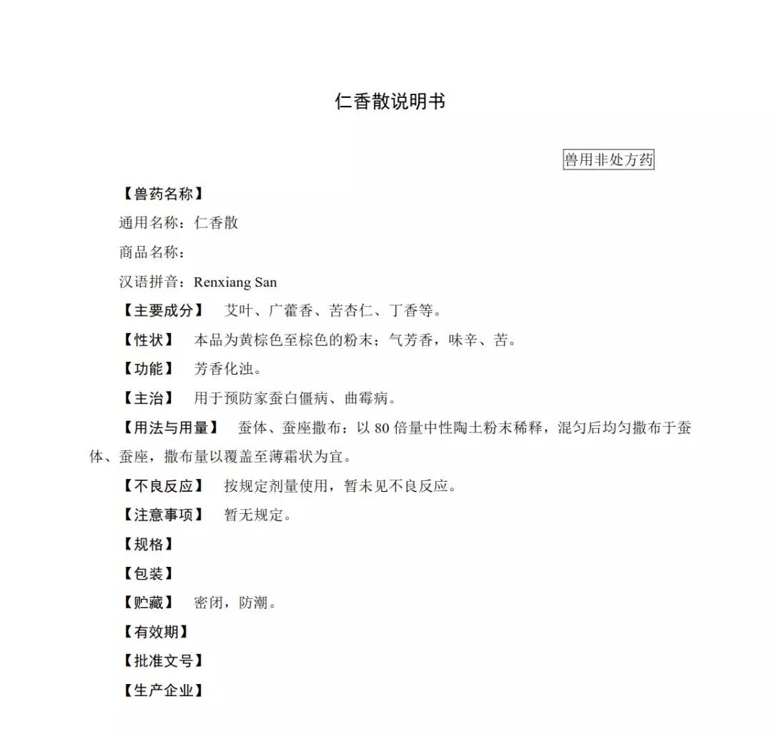 | 仁香散 | 500g | 預(yù)防家蠶白僵病、曲霉病 | 5224 |