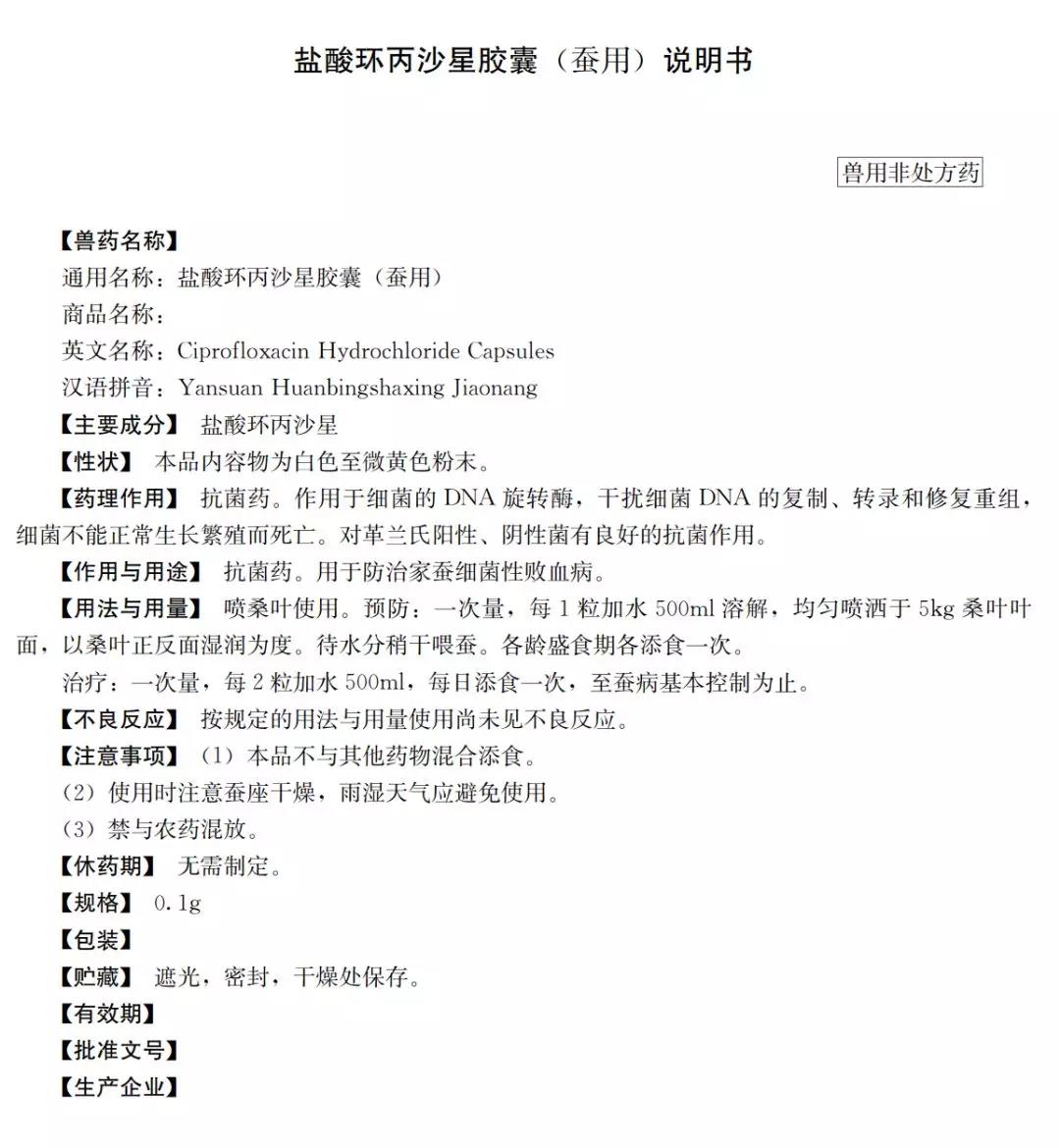 | 鹽酸環(huán)丙沙星膠囊(蠶用) | 100mg | 防治家蠶細(xì)菌性敗血病 | 9809 |