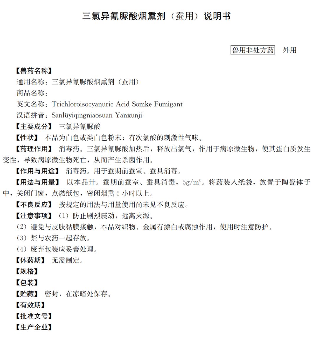 | 三氯異氰脲酸煙熏劑(蠶用) | 含有效氯(Cl)不得少于47.5% | 蠶期前蠶室、蠶具消毒 | 9807 |