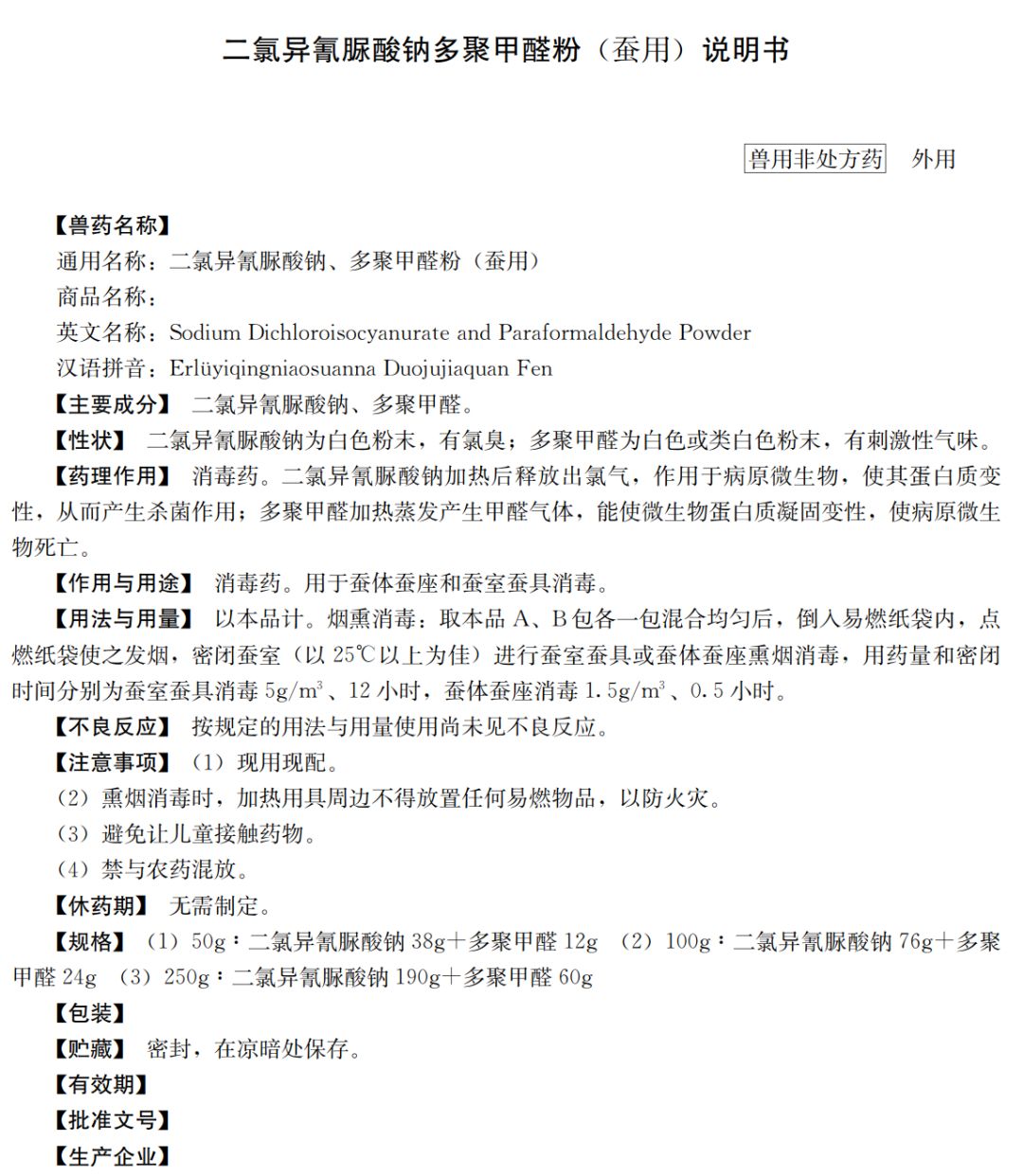 | 二氯異氰脲酸鈉多聚甲醛粉(蠶用) | 50g:二氯異氰脲酸鈉38g+聚甲醛12g | 蠶體蠶座和蠶室蠶具消毒 | 9828 |