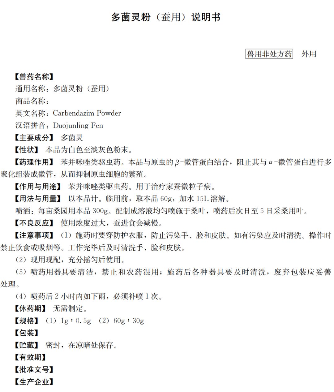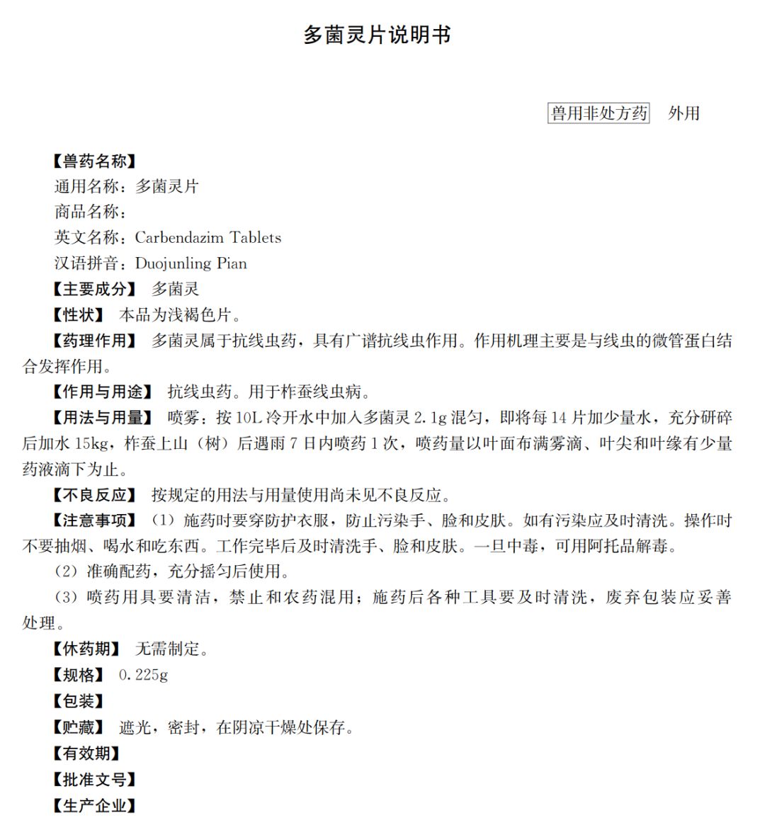 | 多菌靈片 | 0.5g:0.225g | 防治柞蠶線蟲病 | 2046 |