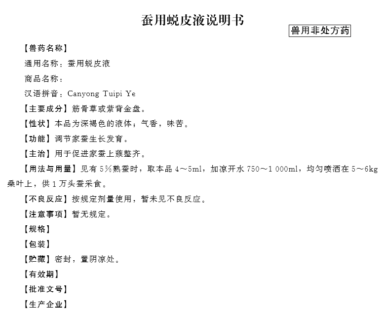 | 蠶用蛻皮液 | 2ml:45mg | 促進(jìn)蠶老熟一致,上簇整齊,調(diào)節(jié)家蠶的生長發(fā)育 | 5152 |