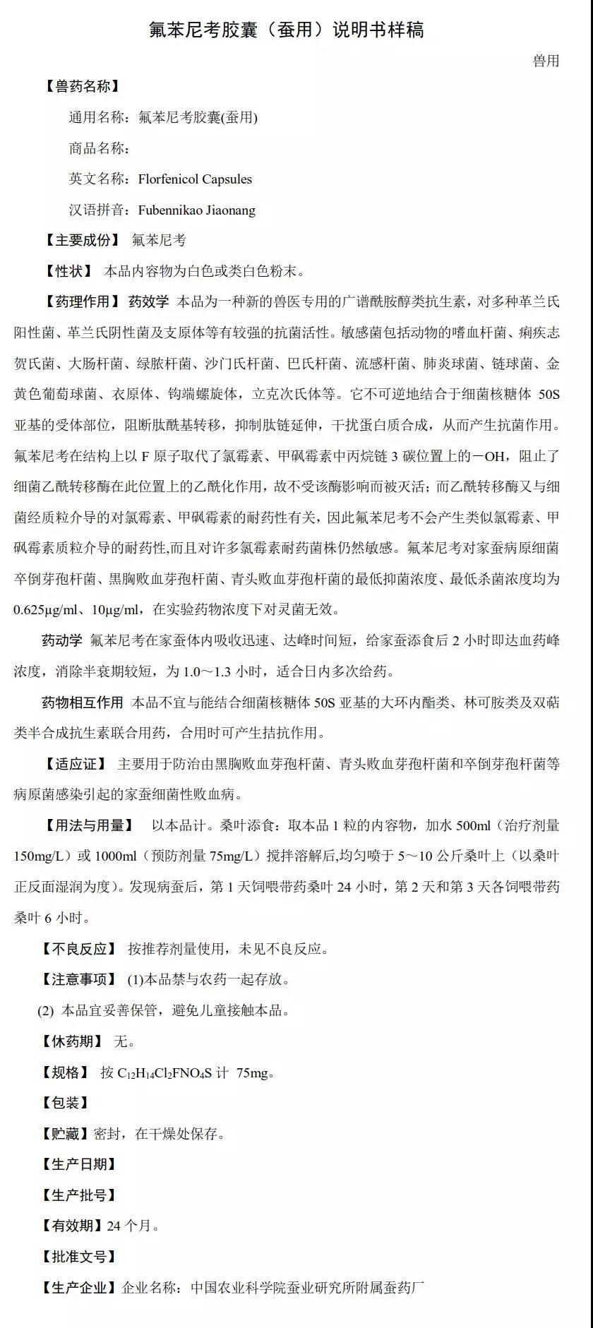 | 氟苯尼考膠囊(蠶用) | 75mg | 防治家蠶黑胸、青頭敗血病 | 2486 |