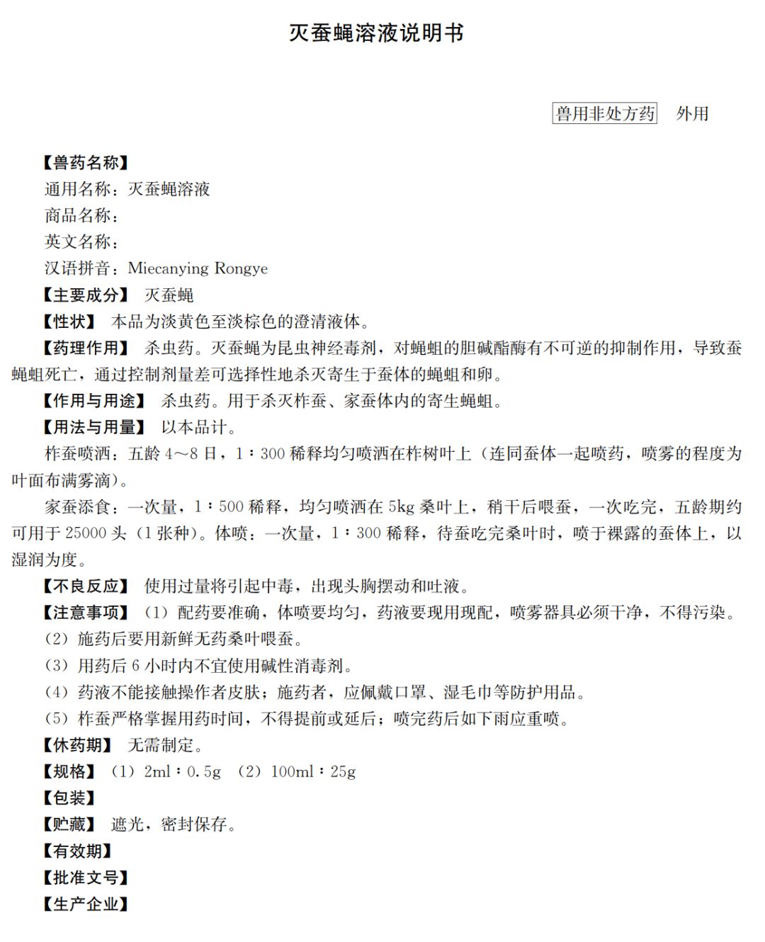 | 滅蒼蠅溶液 | 100ml:25g | 滅殺柞蠶、桑蠶體內(nèi)的蠅蛆 | 9826 |