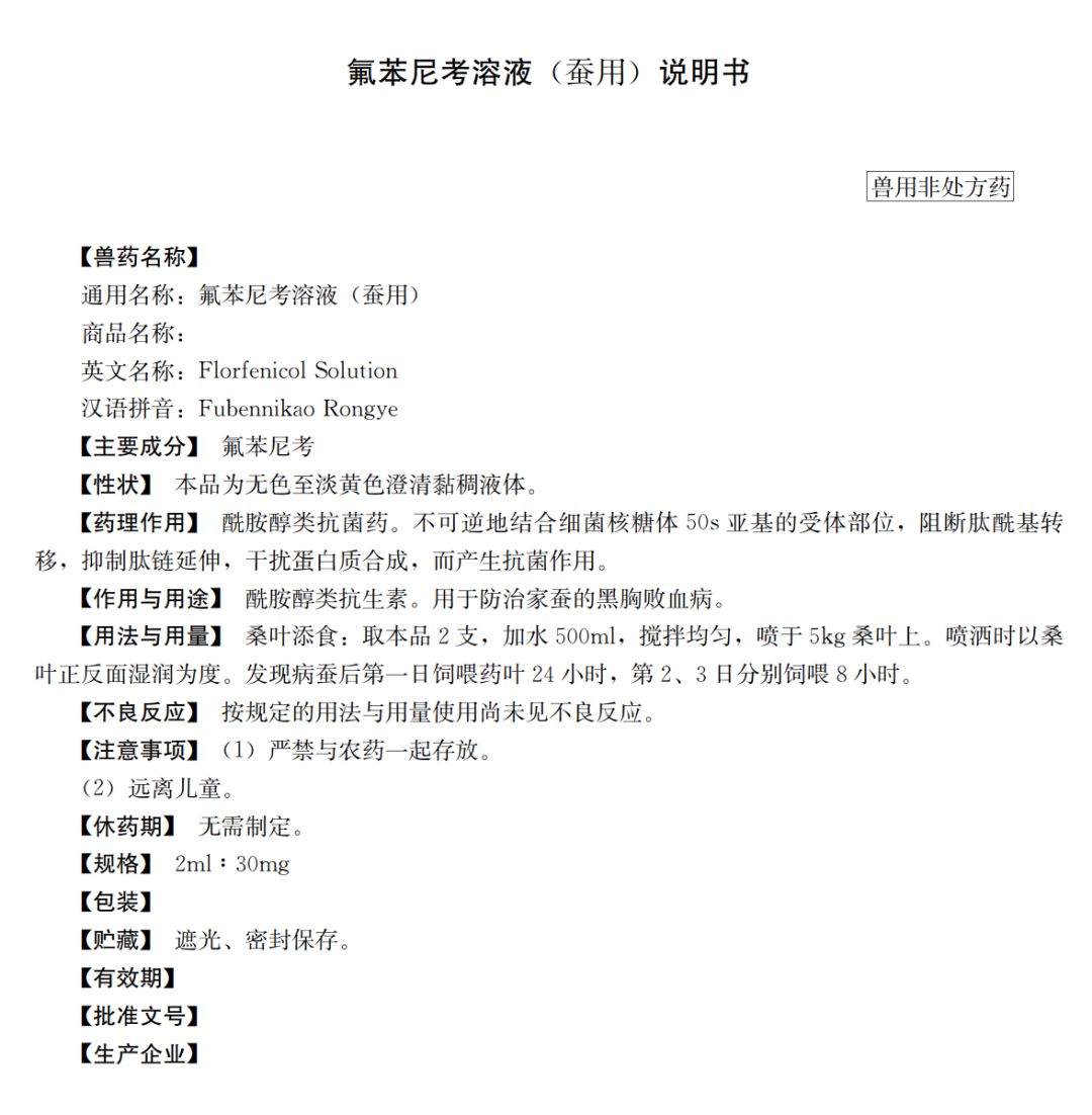 | 氟苯尼考溶液(蠶用) | 2ml:0.03g | 防治家蠶黑胸敗血病 | 9848 |