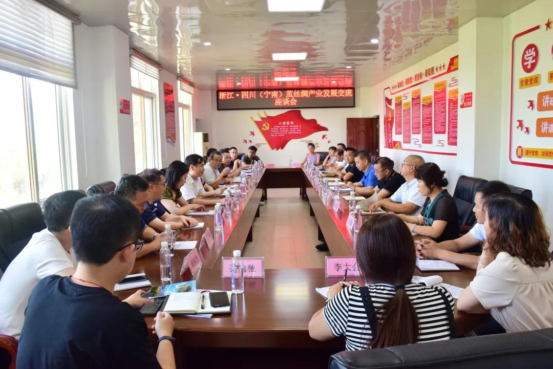 四川是我省高品質(zhì)綢緞生產(chǎn)原料的主要供應(yīng)地,為加強川浙兩省絲綢企業(yè)合作,協(xié)會吳金根會長帶隊,于近期組織浙江米賽絲綢有限公司、湖州新宇絲織有限公司、嘉興市特欣織造有限公司、嘉興星河織造有限公司、湖州菱湖東方絲綢科技有限公司、浙江華芝絲綢股份有限公司、桐鄉(xiāng)市佳鵬紡織有限公司、桐鄉(xiāng)市華雷絲綢股份有限公司、湖州榮利福絲織有限公司等絲綢織造企業(yè)負責(zé)人赴四川高品位生絲生產(chǎn)企業(yè)進行考察交流,四川省絲綢協(xié)會陳祥平會長全程陪同。7月19日,考察團來到寧南縣南絲路集團公司進行考察交流。寧南縣委常委洪開明、寧南縣政府副縣長劉興舟、寧南縣農(nóng)業(yè)農(nóng)村局副局長徐應(yīng)品、南絲路董事長林平和南絲路其它相關(guān)負責(zé)人熱情接待。