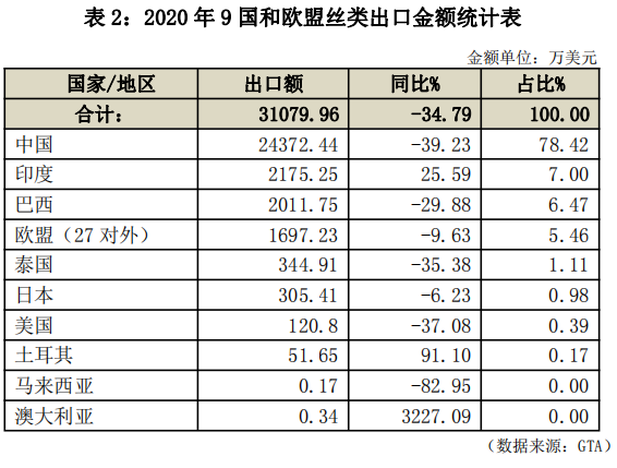 2020年9國(guó)和歐盟出口絲類9859.59噸,同比下降22.32%。中國(guó)、印度、巴西和歐盟為最主要供應(yīng)者,出口數(shù)量合計(jì)9457噸,合計(jì)占比達(dá)95.92%。其中,只有印度出口量增長(zhǎng)38.6%,而中國(guó)、巴西和歐盟出口量則降幅均較大,分別為37.79%、21.44%和16.98%。