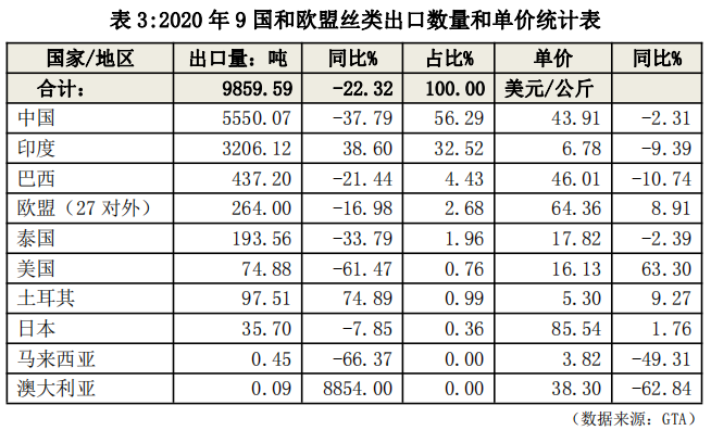 從平均單價(jià)看,絲類主要供應(yīng)者中只有歐盟的出口價(jià)格同比增長(zhǎng)8.91%,而中國(guó)、印度和巴西的出口單價(jià)均下降,降幅為2.31%、9.39%和10.74%。(詳見(jiàn)表3)。