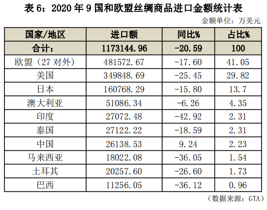 值得關(guān)注的是,在9國(guó)和歐盟中,只有中國(guó)絲綢商品進(jìn)口實(shí)現(xiàn)增長(zhǎng),且增幅達(dá)9.24%。