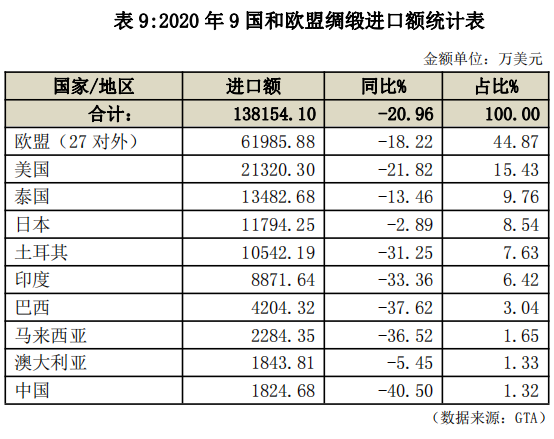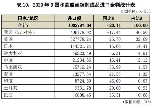 2020年,9國(guó)和歐盟絲類進(jìn)口3.21億美元,同比下降32.01%;綢緞進(jìn)口13.82億美元,同比下降20.96%;制成品進(jìn)口100.28億美元,同比下降20.11%。