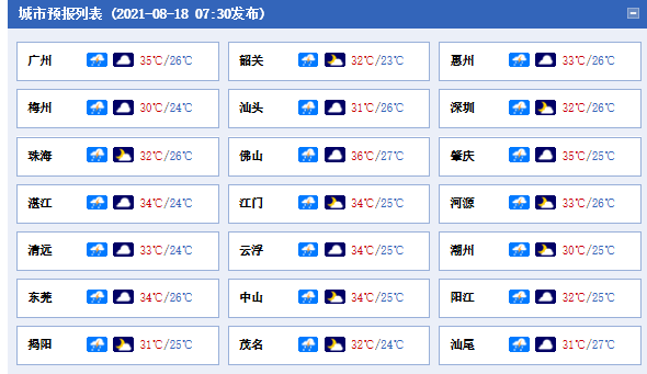 城市中,廣州,今天多云間晴天,局部地區(qū)有(雷)陣雨;氣溫27℃~33℃;西南風2~3級;相對濕度55%~90%。