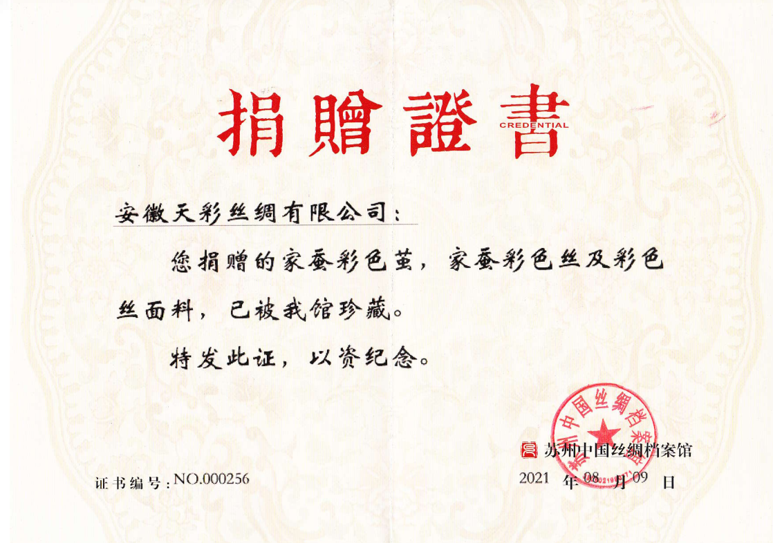 2021年8月,在安徽省農(nóng)科院蠶桑研究所的大力支持下,安徽天彩絲綢有限公司向蘇州中國絲綢檔案館捐贈了家蠶彩色繭、家蠶彩色絲及彩色絲綢面料等具有自主知識產(chǎn)權(quán)的彩色絲綢產(chǎn)品,收到該館的歡迎和稱贊。