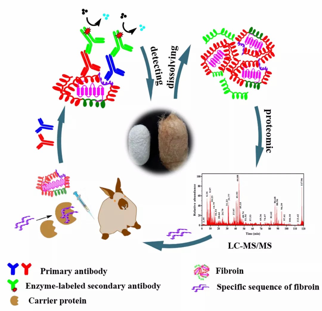 以絲素蛋白水解液和多肽序列為抗原,采用動物免疫制備得到可對古代絲綢進(jìn)行專一性識別的兔抗絲素蛋白多克隆抗體和單克隆抗體。制備得到的絲素蛋白抗體具有較高的靈敏度和特異性,多克隆抗體最低檢出限為0.1 ng/mL,單克隆抗體最低檢出限為4.65ng/mL,對墓葬中存在的干擾抗原均呈現(xiàn)陰性,能夠?qū)崿F(xiàn)絲織品的高效檢測。
