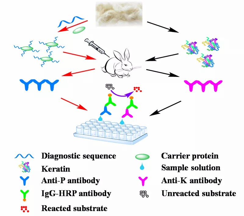以山羊毛角蛋白的區(qū)別特征氨基酸序列為半抗原,綿羊毛角蛋白為完全抗原,制備多克隆兔抗山羊毛角蛋白P抗體和多克隆兔抗綿羊毛角蛋白K抗體。P抗體和K抗體在最佳稀釋倍數(shù)條件下采用間接ELISA測定兩種抗體均具有較高的靈敏度和特異性,其對抗原的最低檢出限分別為6.81ng/mL和81.39ng/mL。兩種抗體均可實現(xiàn)羊毛織物的鑒定。