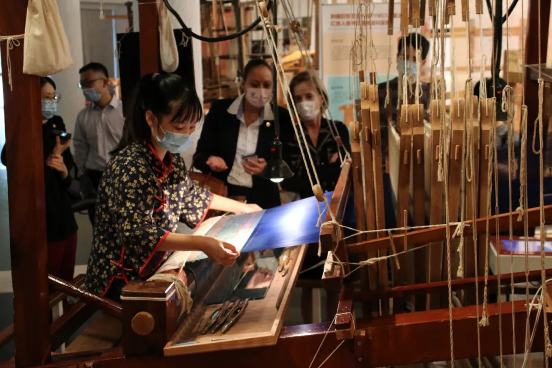 跟隨著專業(yè)講解員的導覽,駐華使節(jié)配偶團參觀了絲路館、非遺館與時裝館整個基本陳列,對中國的絲綢文化表達了濃度興趣和贊嘆,從絲綢起源、古代絲綢服飾文化、古代織機與織造技藝等多個方面提問、交流。博物館的古代織造技藝表演讓大家近距離感受到了中國傳統(tǒng)的蠶桑絲織技藝。嘉賓們還向講解員詢問了真絲的辨別技巧。在錦繡廊參觀了文創(chuàng)商店并購買了絲綢紀念品。