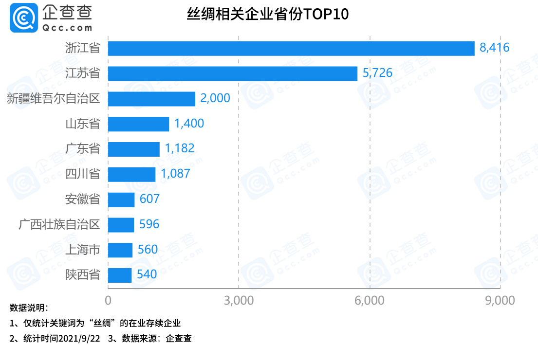 企查查數(shù)據(jù)顯示,浙江省絲綢企業(yè)數(shù)量最多,擁有8416家相關(guān)企業(yè),領(lǐng)先于全國(guó)其他省份,占全國(guó)總量的32%。江蘇省、新疆維吾爾自治區(qū)分別以5726家和2000家排名二三位。
