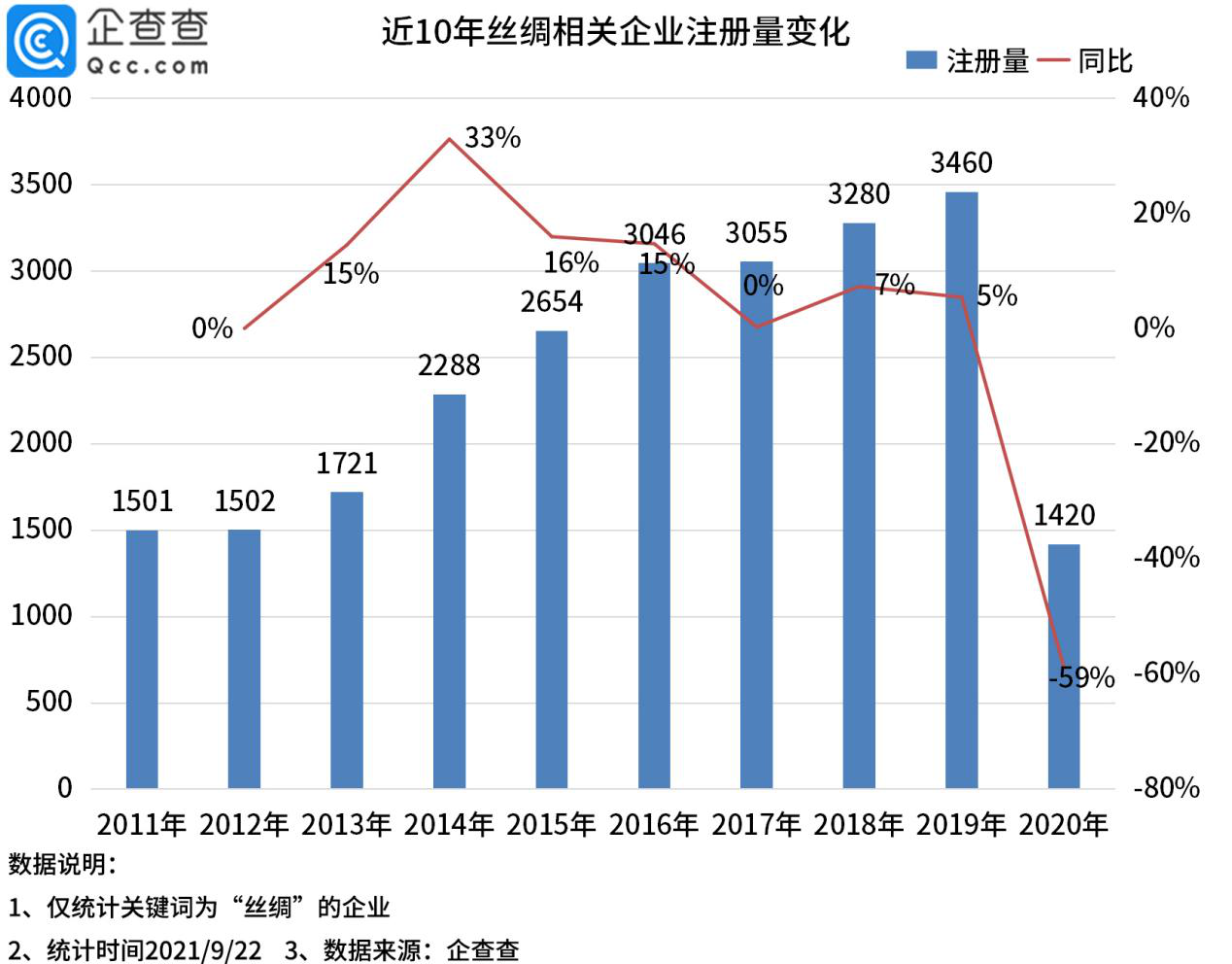 企查查數(shù)據(jù)顯示,2011年至2019年我國(guó)絲綢相關(guān)企業(yè)年注冊(cè)量逐年攀升,2014年增速是近10年來(lái)最高的,同比增長(zhǎng)33%。2019年注冊(cè)量為歷年來(lái)最高,達(dá)3460家,同比增長(zhǎng)5%。2020年注冊(cè)量略有下降,為1420家,同比下降59%。