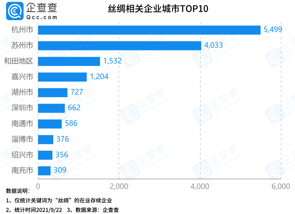 企查查數(shù)據(jù)顯示,杭州市絲綢相關(guān)企業(yè)數(shù)量最多,達(dá)5499家,占浙江省總量的65%。蘇州市、和田地區(qū)分別以4033家和1532家位列二三位。