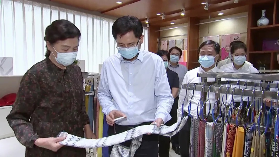 藍(lán)天立在嘉聯(lián)公司產(chǎn)品展示廳了解絲綢產(chǎn)品和品牌打造情況