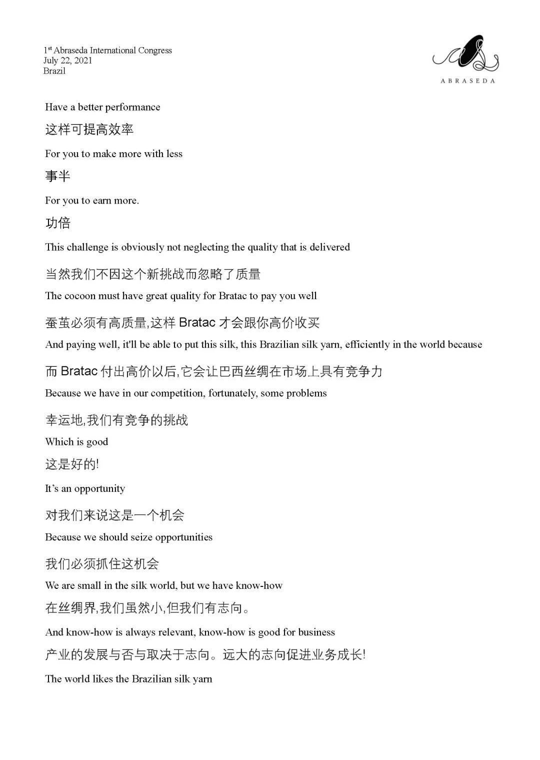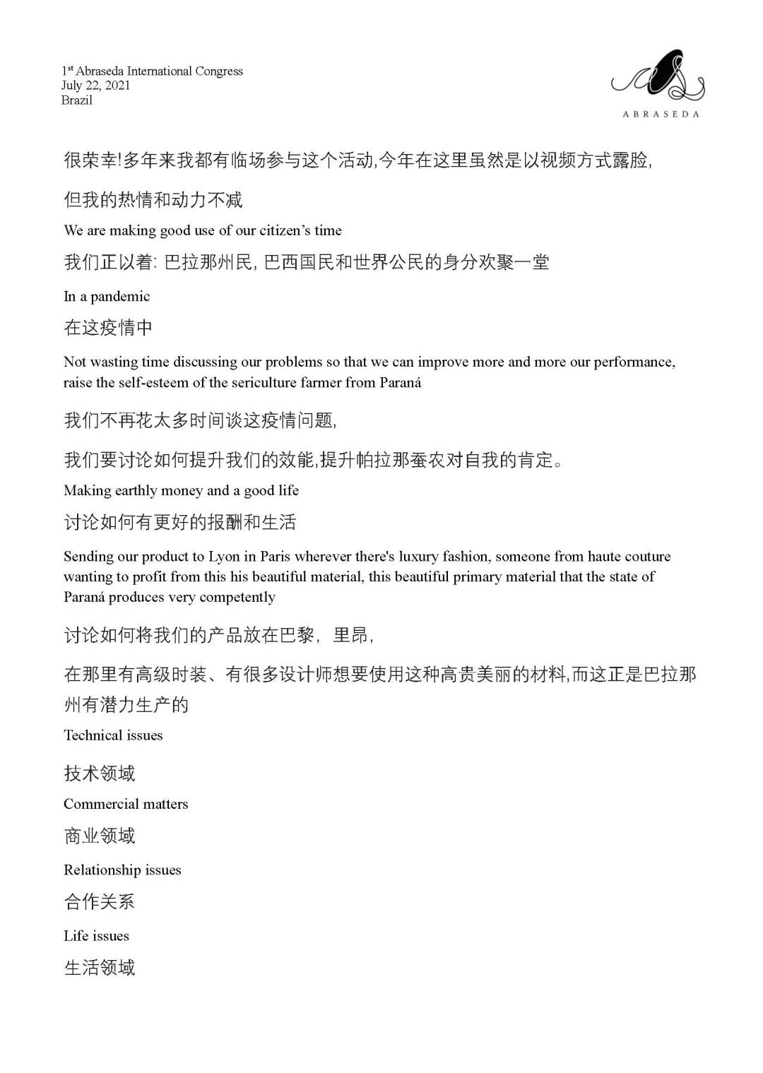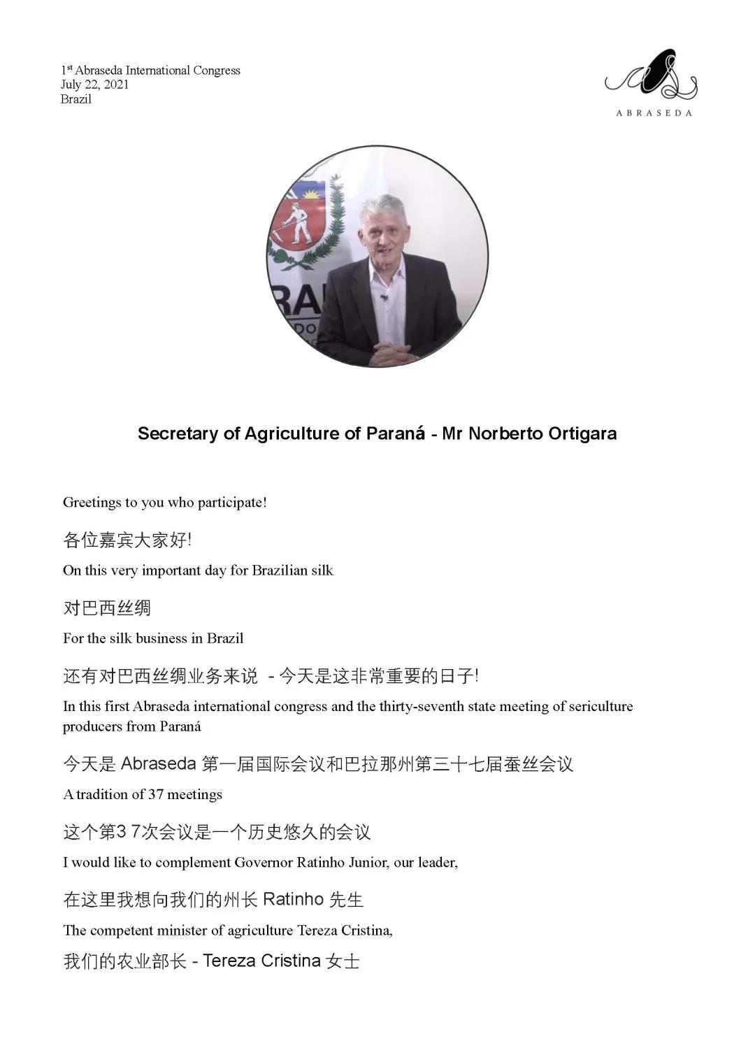 第一屆巴西絲綢協(xié)會國際會議 | 巴拉那州農(nóng)業(yè)局局長Norberto Ortigara致辭