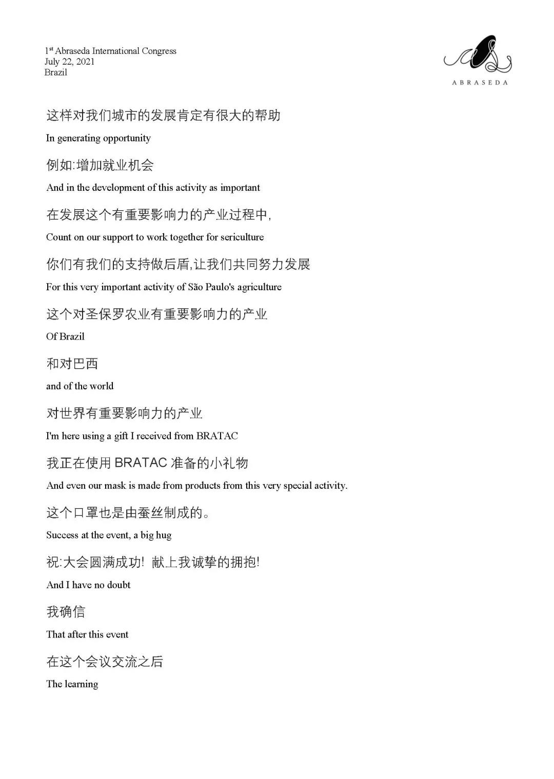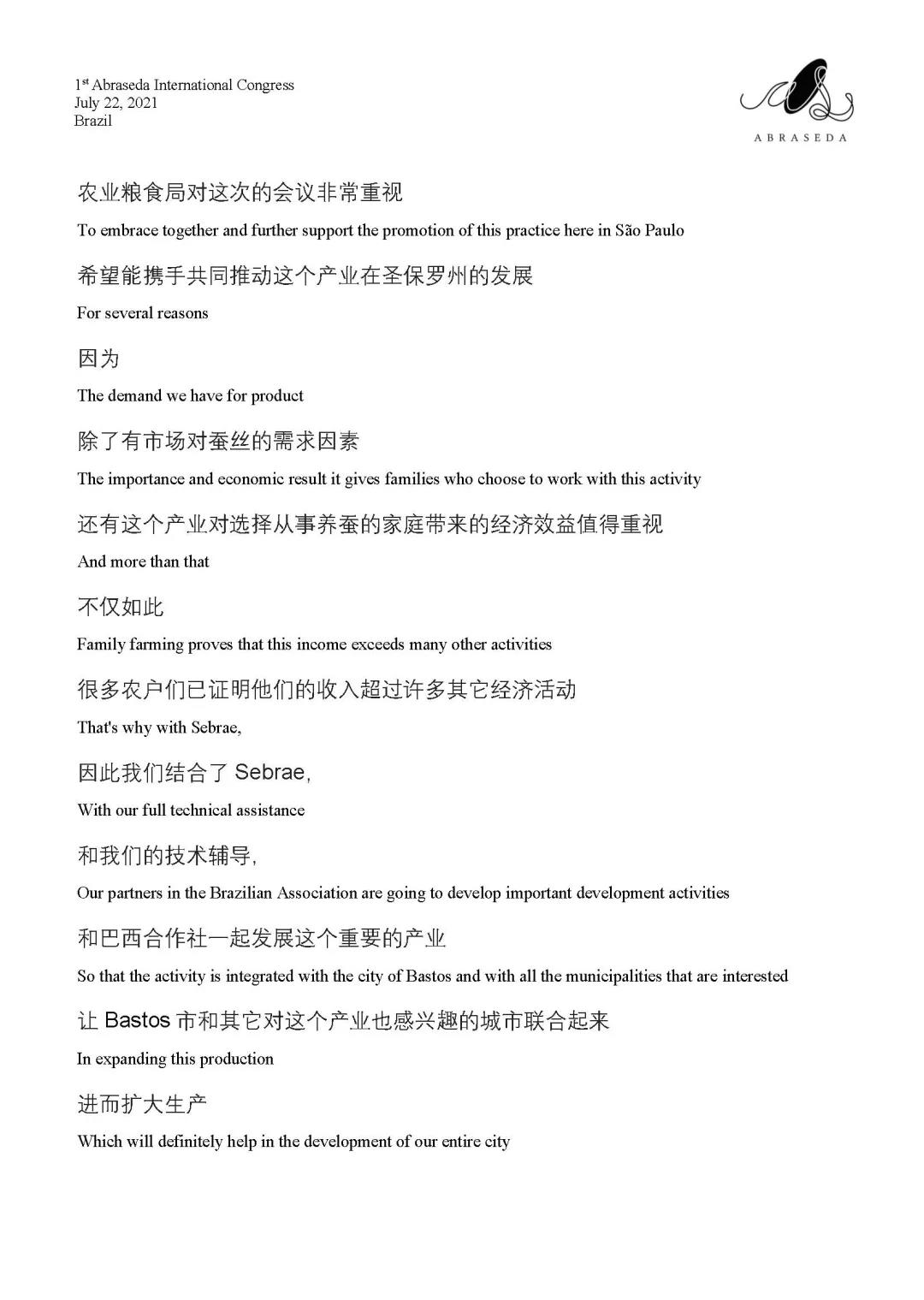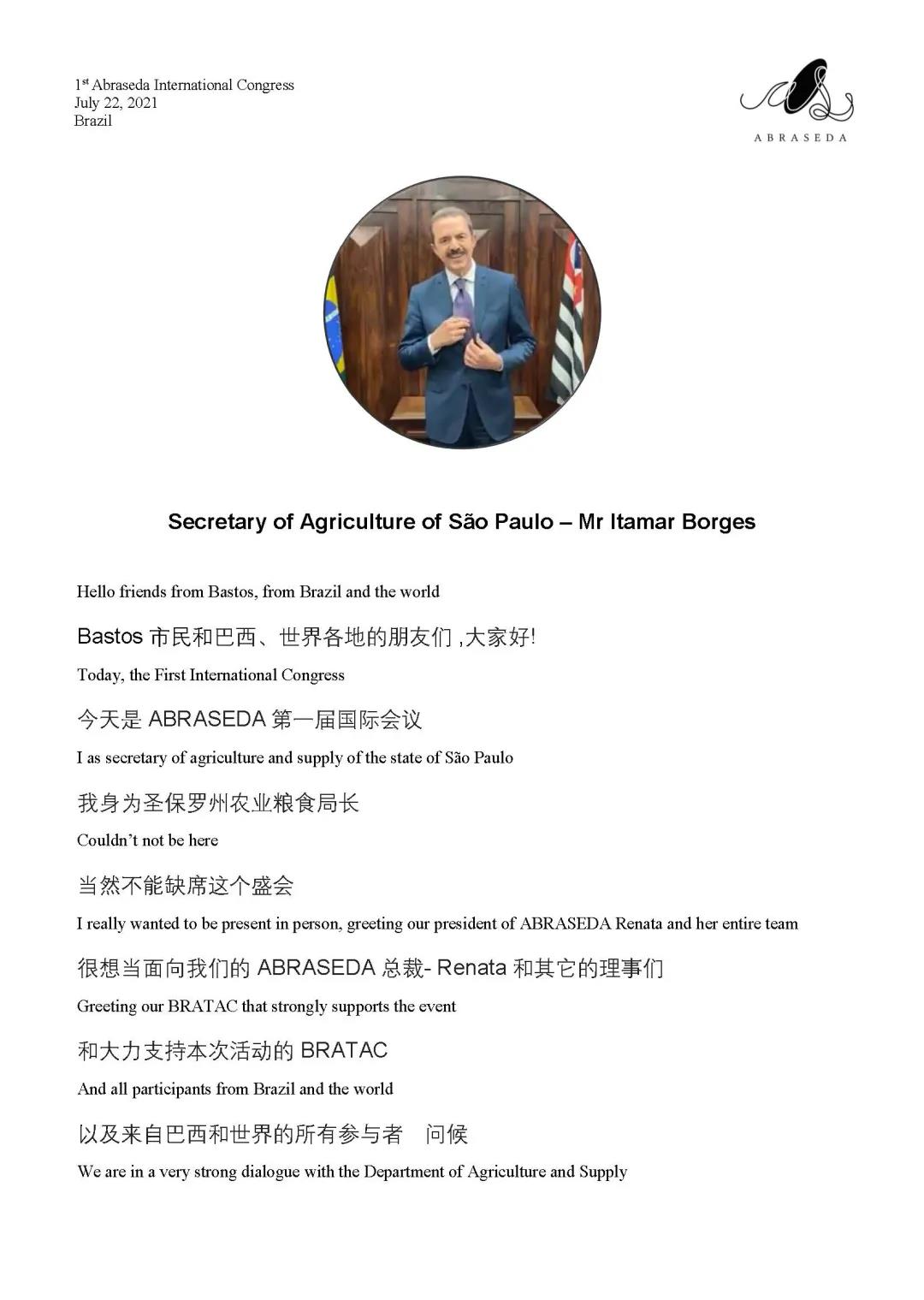 第一屆巴西絲綢協(xié)會(huì)國(guó)際會(huì)議 | 圣保羅州農(nóng)業(yè)糧食局局長(zhǎng)Itamar Borges致辭