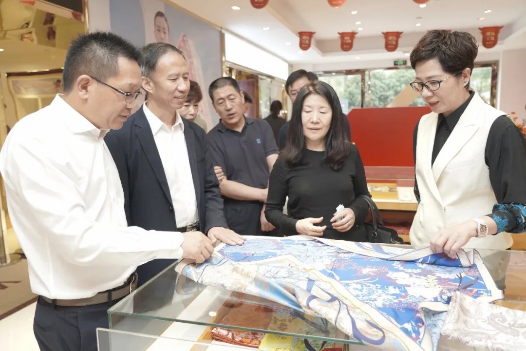 在萬事利集團(tuán)董事長(zhǎng),杭州市絲綢行業(yè)協(xié)會(huì)會(huì)長(zhǎng)屠紅燕的帶領(lǐng)下,曲英一行重點(diǎn)調(diào)研了旗下絲綢產(chǎn)業(yè)的創(chuàng)新發(fā)展和對(duì)非遺絲織技藝的傳承保護(hù)。全球領(lǐng)先的雙面數(shù)碼印花技術(shù)、AI智能花型設(shè)計(jì)師、助力鄉(xiāng)村共富的黃金蠶絲被、直播經(jīng)濟(jì)下的萬事利主播天團(tuán)……萬事利絲綢對(duì)于傳統(tǒng)絲綢產(chǎn)業(yè)的顛覆和創(chuàng)新表達(dá),讓曲英一行表示稱贊。
