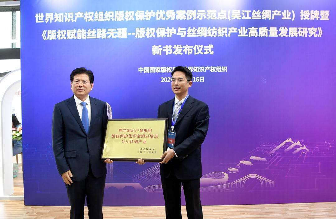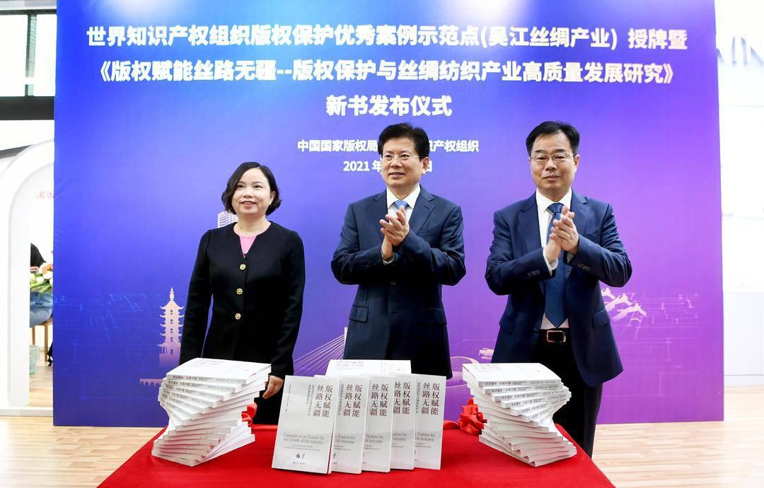 10月16日,在第八屆中國國際版權(quán)博覽會上,國家版權(quán)局和世界知識產(chǎn)權(quán)組織舉辦“世界知識產(chǎn)權(quán)組織版權(quán)保護優(yōu)秀案例示范點(吳江絲綢產(chǎn)業(yè))”授牌暨《版權(quán)賦能 絲路無疆——版權(quán)保護與絲綢紡織產(chǎn)業(yè)高質(zhì)量發(fā)展研究》新書發(fā)布儀式,正式宣告圍繞版權(quán)賦能吳江絲綢高質(zhì)量發(fā)展開展的調(diào)查研究工作圓滿結(jié)束,調(diào)研項目成果將由世界知識產(chǎn)權(quán)組織向全球推廣。儀式上,中宣部副部長張建春向蘇州市吳江區(qū)委副書記錢斌頒發(fā)“世界知識產(chǎn)權(quán)組織版權(quán)保護優(yōu)秀案例示范點(吳江絲綢產(chǎn)業(yè))”牌匾,并與世界知識產(chǎn)權(quán)組織中國辦事處主任劉華,中共江蘇省委宣傳部常務副部長、省新聞出版局(省版權(quán)局)局長焦建俊,共同為圖書《版權(quán)賦能 絲路無疆》揭幕。
