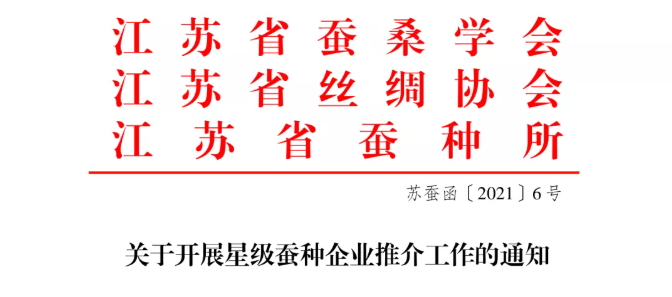 為加快推進江蘇現(xiàn)代蠶種產(chǎn)業(yè)高質(zhì)量發(fā)展,提升蠶種企業(yè)市場競爭力,營造蠶種業(yè)創(chuàng)新發(fā)展的良好環(huán)境,做大做強江蘇蠶種產(chǎn)業(yè),結(jié)合全省種業(yè)發(fā)展工作部署,經(jīng)研究,決定在全省范圍內(nèi)開展“星級蠶種企業(yè)”推介工作?,F(xiàn)將有關(guān)事項通知如下: