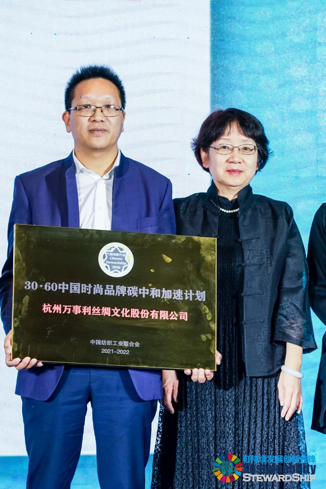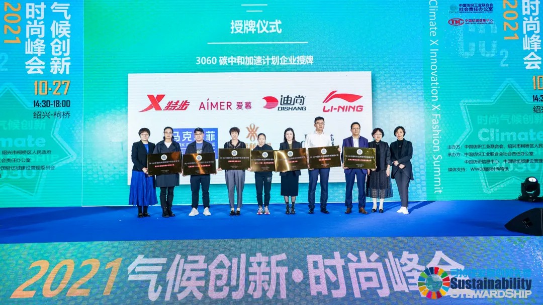 在2021氣候創(chuàng)新·時(shí)尚峰會(huì)上,中國(guó)紡織工業(yè)聯(lián)合會(huì)為參與“30·60中國(guó)時(shí)尚品牌碳中和加速計(jì)劃”的企業(yè)進(jìn)行了授牌。