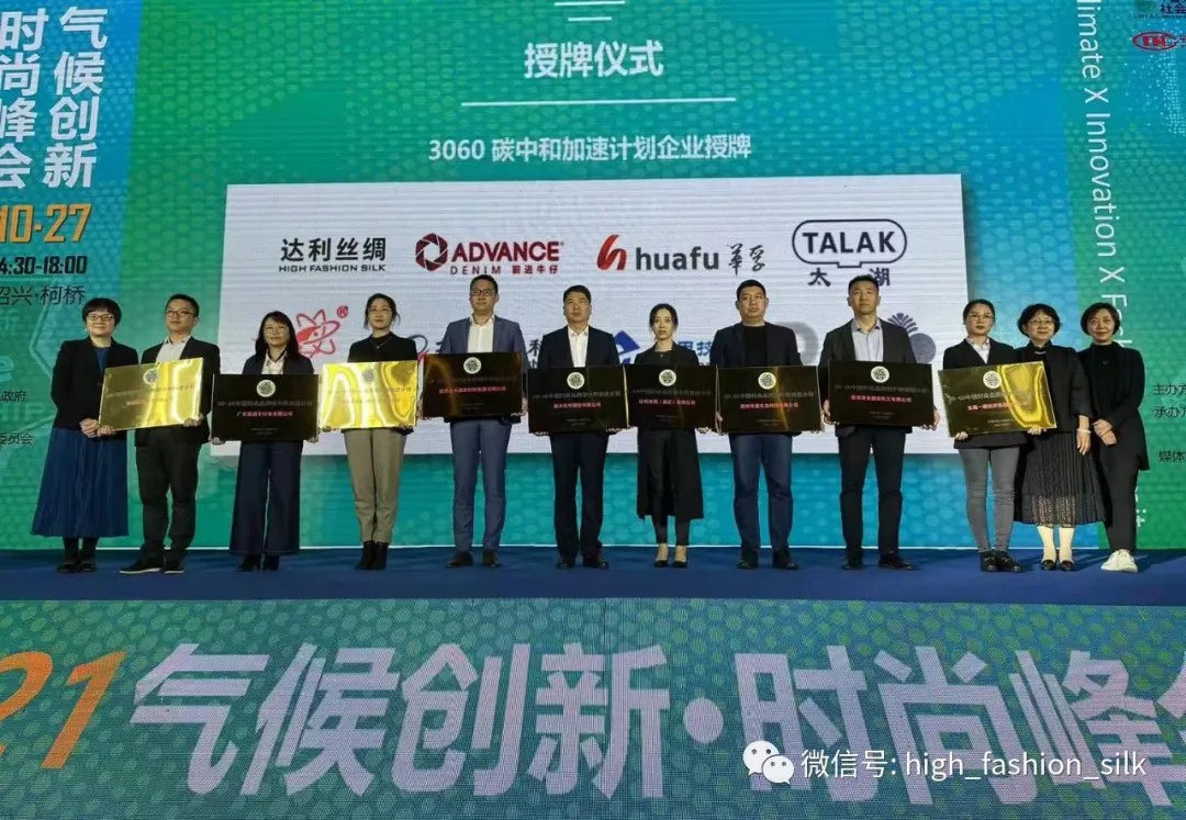 大會隆重舉行了紡織服裝行業(yè)第一批3060碳中和加速計劃企業(yè)授牌儀式。達利絲綢被中國紡織工業(yè)聯(lián)合會授予“30.60中國時尚品牌碳中和加速計劃企業(yè)”。