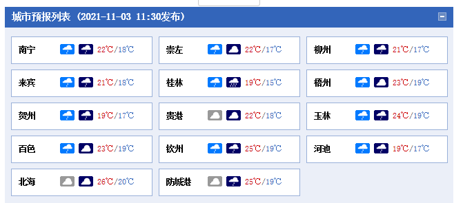 南寧市:今天白天到晚上,陰天有小雨,東北轉東南風1~2級,最高氣溫23℃,最低氣溫18℃。