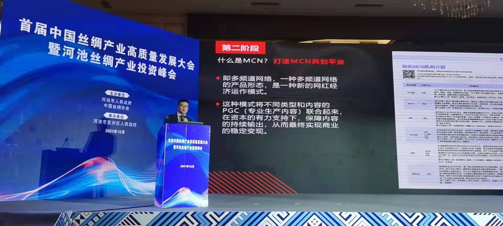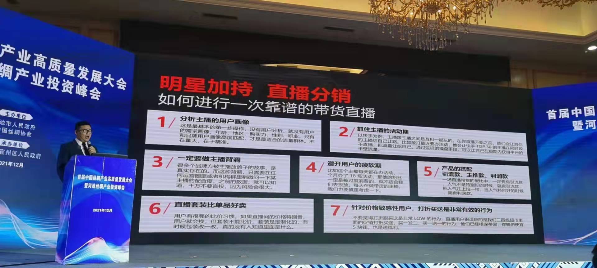 洪錦團(tuán)先生從打造網(wǎng)紅爆款產(chǎn)品、打造MCN共創(chuàng)平臺、協(xié)同構(gòu)建絲綢產(chǎn)業(yè)生態(tài)等方面進(jìn)行了精彩的分享。