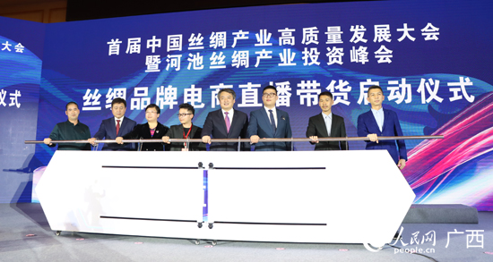 河池市人民政府市長王軍,河池市人民政府副市長、中共宜州區(qū)委書記翟紅玲,宜州區(qū)人民政府區(qū)長戚嘯,百銳控股有限公司董事長洪錦團(tuán),廣西君創(chuàng)達(dá)人文化有限公司董事長卓君,上海土撥鼠網(wǎng)絡(luò)科技有限公司創(chuàng)始人韋其良,廣西新靈獸網(wǎng)絡(luò)科技有限公司總經(jīng)理劉基斌,廣西巧婦九妹電子商務(wù)有限公司總經(jīng)理盧其送一起上臺啟動絲綢品牌電商帶貨直播。