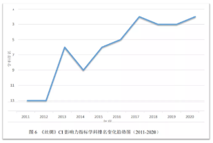 中國知網(wǎng)每年發(fā)布的綜合評價(jià)指標(biāo)“影響力指數(shù)(CI)”是將總被引頻次和影響因子兩個(gè)代表性評價(jià)指標(biāo)進(jìn)行向量平權(quán)計(jì)算,較為客觀地反映了期刊學(xué)術(shù)影響力的相對水平,在國內(nèi)取得了較高的認(rèn)可度。如圖6所示,在紡織科學(xué)技術(shù)學(xué)科37種期刊的影響力指數(shù)排序中,《絲綢》長期排名前列,2020年起排名穩(wěn)定在第2位。