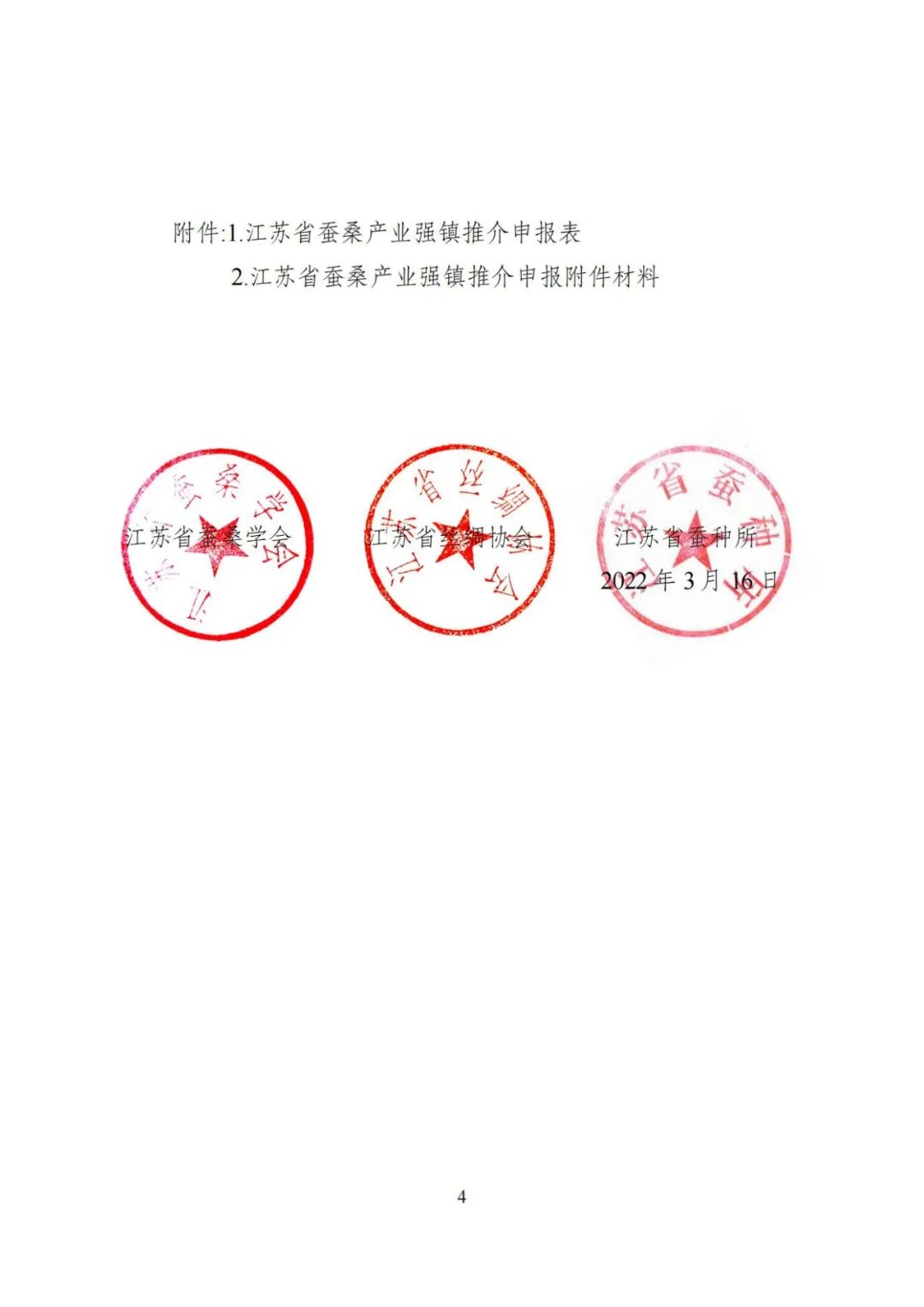 (四)按時報送材料。請縣(市、區(qū))農(nóng)業(yè)農(nóng)村主管部門牽頭,組織轄區(qū)內(nèi)符合條件的鎮(zhèn)(鄉(xiāng)、街道)積極申報。認真填寫《江蘇省蠶桑產(chǎn)業(yè)強鎮(zhèn)推介申報表》,如實提供相關附件材料。申請表及附件材料裝訂成冊、一式兩份,經(jīng)設區(qū)市、縣(市、區(qū))農(nóng)業(yè)農(nóng)村部門審核后,于2022年4月15日前寄送江蘇省蠶種所(無錫市惠山區(qū)錢橋街道盛岸西路618號,郵編:214151)。